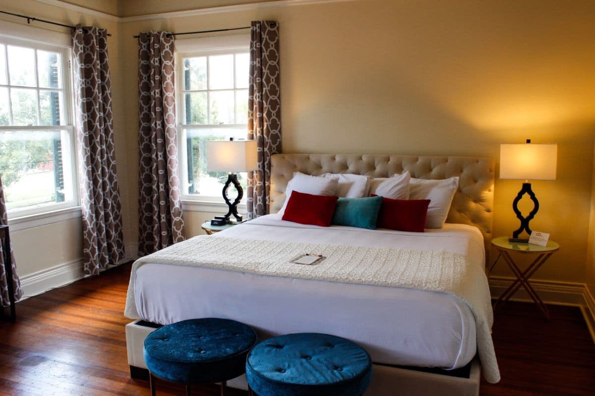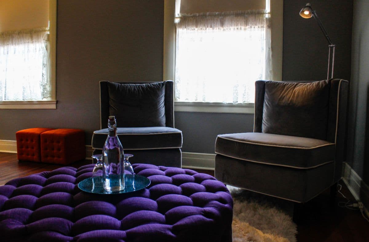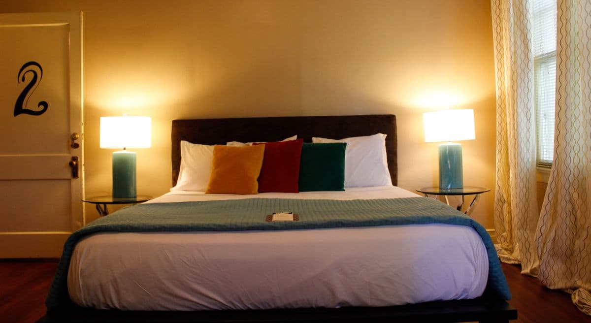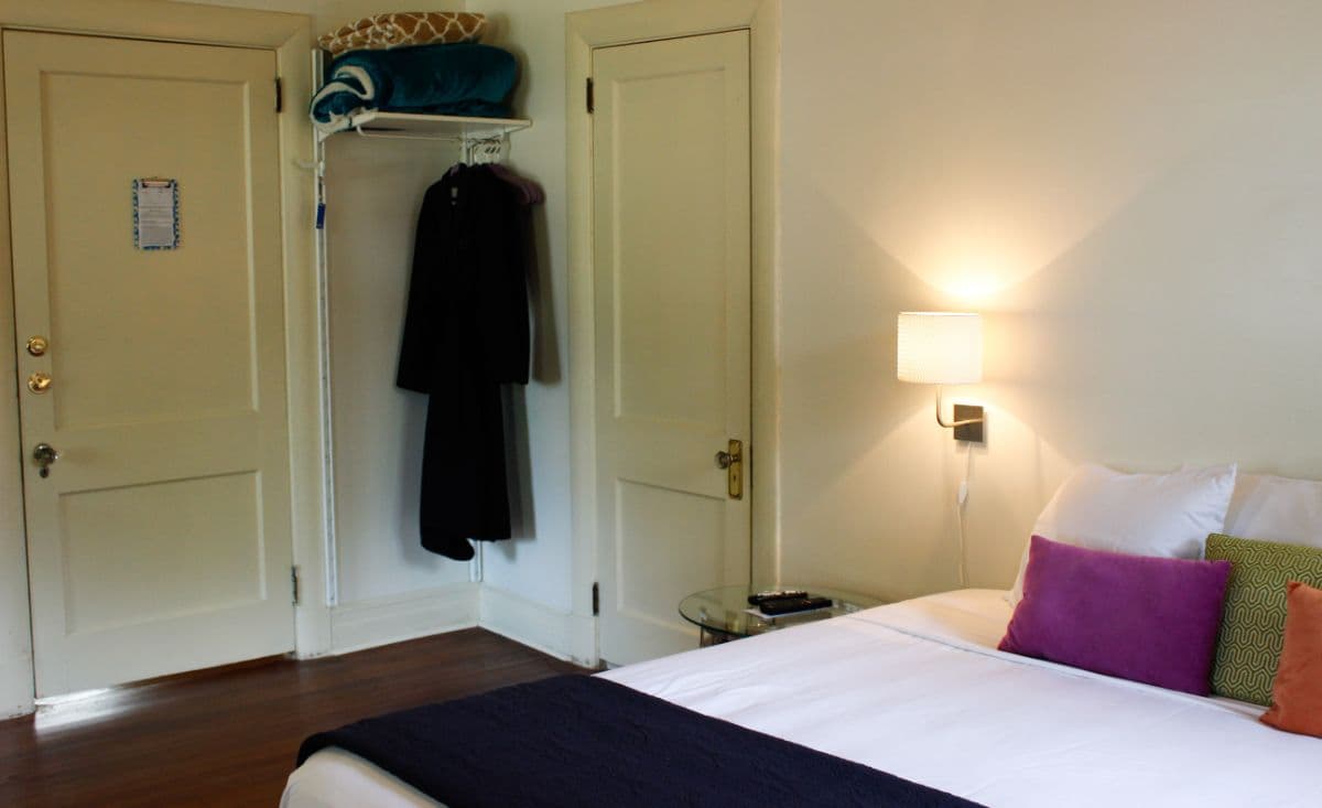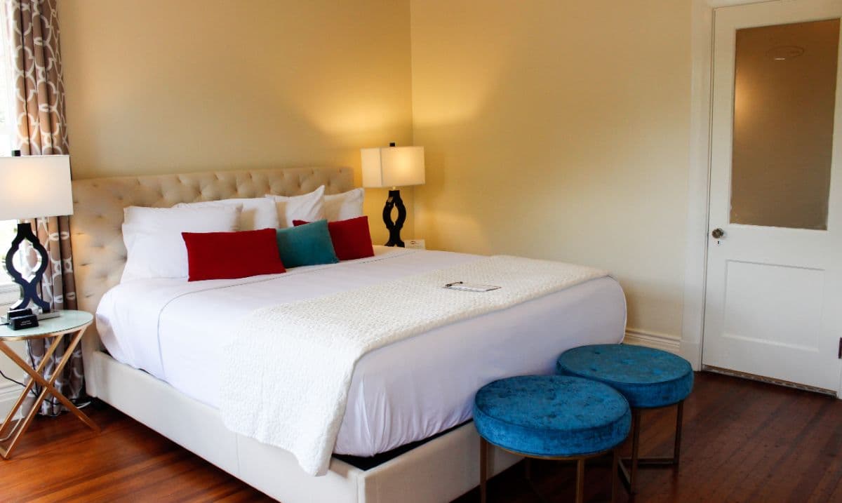 Ground floor, quiet back corner room accessed by it's own private entry hall. With windows overlooking the side garden, a king size bed, and decor that is a foodie's delight with colors of chocolate and espresso, accented with pops of teal. Private bath has original tile floor, and a tub/shower combination. Free off-street parking. Smart TV. Wireless internet. Breakfast included. Hair dryer. Robes. Other guest comforts. No children under 12 years of age. No pets (service animals welcome). No smoking. No kidding.
